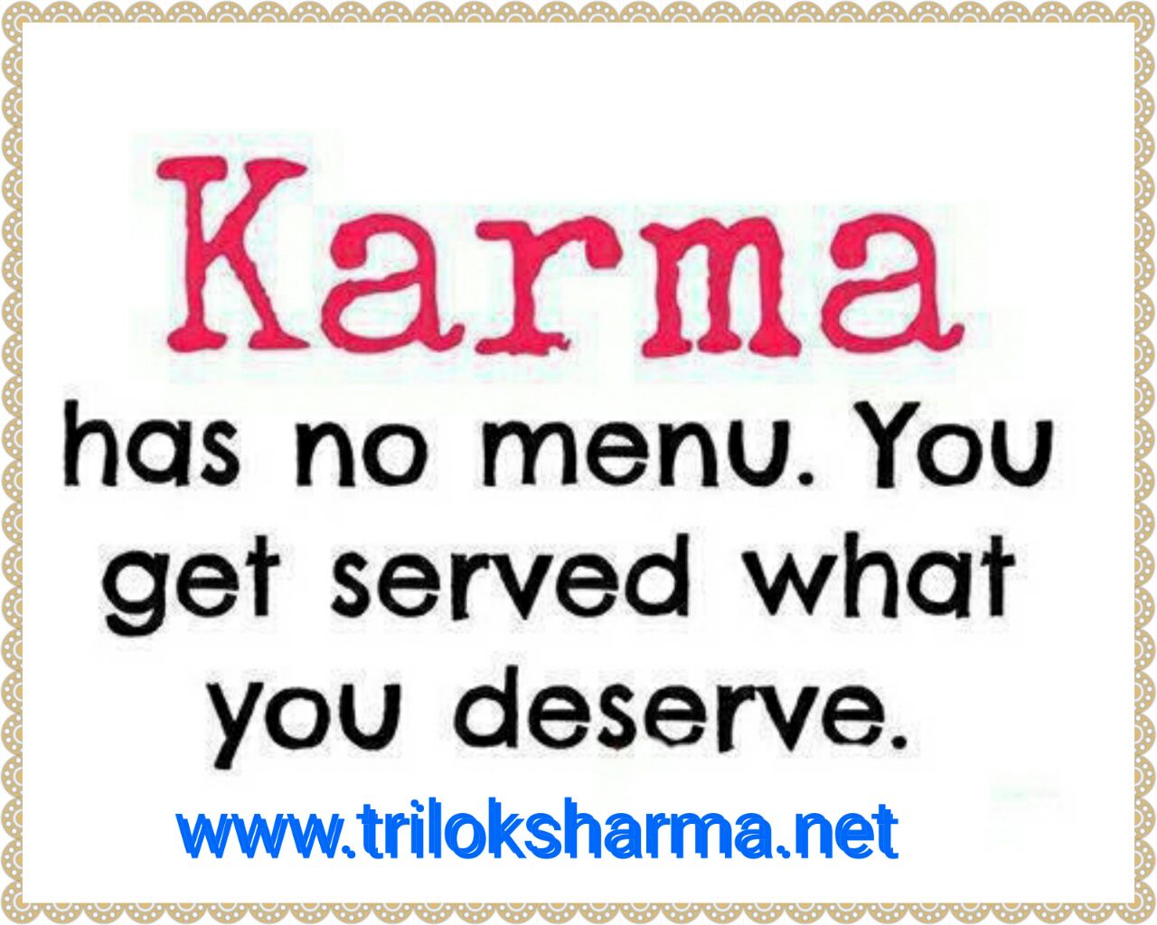 karma, kárma or kárman (Sanskrit: कर्म, “act, action, performance”) — is a noun-form coming from the root kri meaning “to do,” “to make.” Literally karma means “doing,” “making,” action. Karma is pronounced as “karmuh,” the “uh” being subtle. Karma can best be translated into English by the word consequence. It corresponds to the “action” or “deed” which causes the entire cycle of cause and effect (i.e., the cycle called saṃsāra). It applies to all levels of action, including thought, word, feeling and deed, and the effects of it.