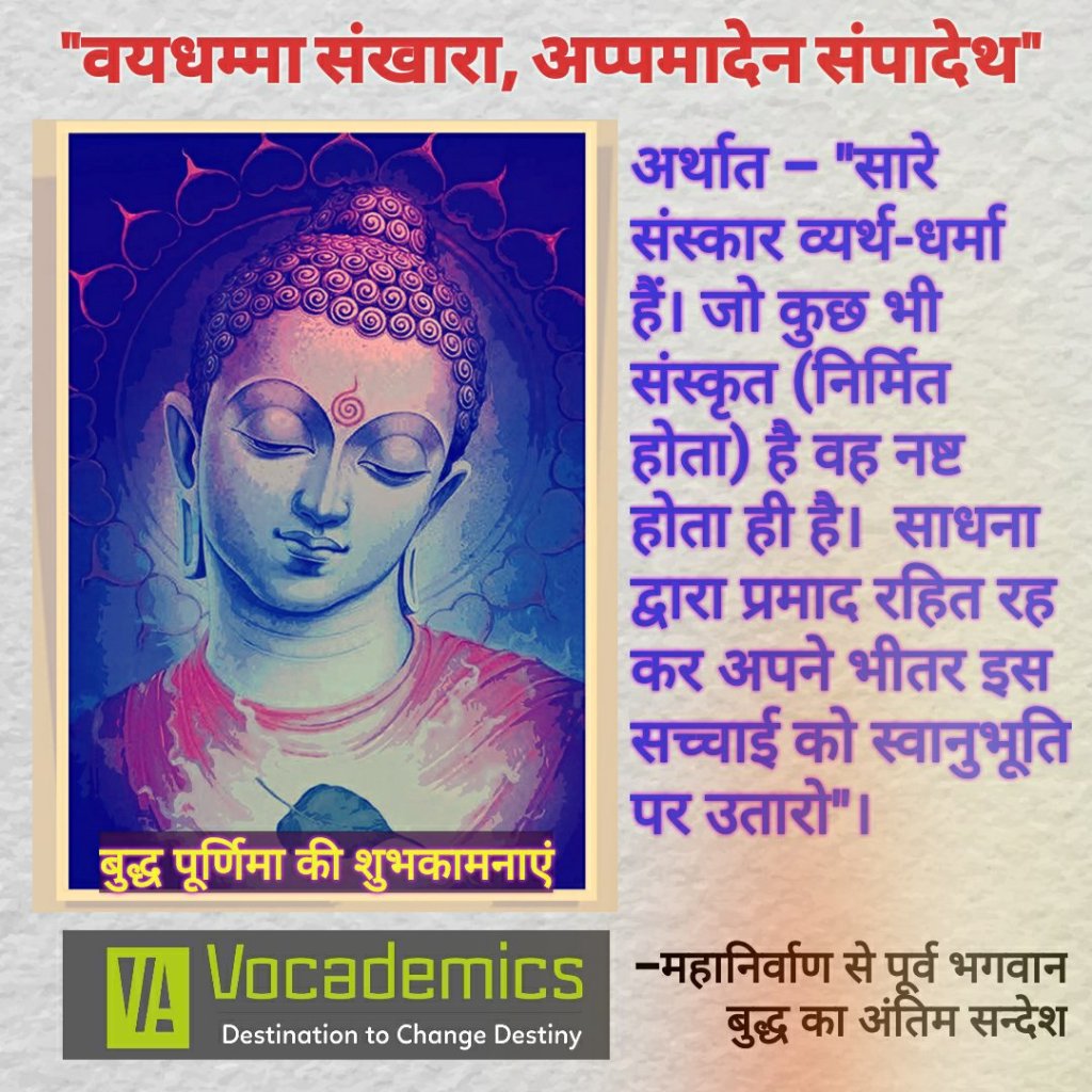 अर्थात – “सारे संस्कार व्यर्थ-धर्मा हैं। जो कुछ संस्कृत अर्थात निर्मित होता है, वह नष्ट होता ही है। साधना द्वारा प्रमाद-रहित रह कर अपने भीतर इस सच्चाई को स्वानुभूति पर उतारो।”